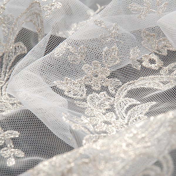 Krajka výšivka na tylu - jemný tyl s lurexovou výšivkou stříbrné barvy motiv květin. Tyl má bílou barvu a je vhodný ke kombinaci s bílým nebo stříbrným saténem či taftem. Látka/metráž je pružná svou vazbou, je průsvtiná a splývavá.