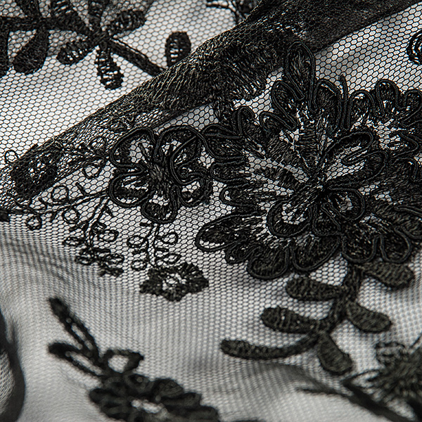 Krajka výšivka na jemném tylu v černé barvě s květinovým motivem. Krajka má nevšední plastickou výšivku - lístečky jsou volně vzdušné neprošité do tylu. Metráž je pružná svou vazbou, splývavá a průsvitná.