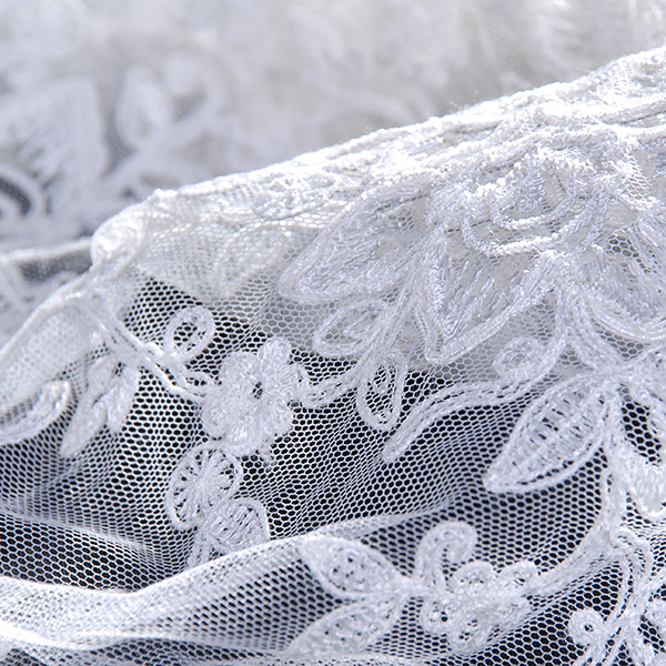 Efektní krajka výšivka na tylu v barvě slonové kosti s květinovým motivem. Metráž je pružná svou vazbou, splývavá a průsvitná.