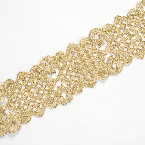 Krajková kovová stuha s vyřezávaným ornamentem ve tvaru kosočtverce. Krajková kovová stuha má svou patinu, je vhodná na dozdobení oděvu nevšedních spoločenských šatů, orientálního kostýmu nebo na dozdobení tašky, klobouku a podobně.