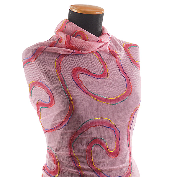 Krep šifon výšivka - jemná šifonová látka s lehce krapatým povrchem doplněna řetízkovou výšivkou v barvách duhy na růžovém podkladě. Krep šifon je průsvitná a splývavá látka, lehce pružná svou vazbou.
