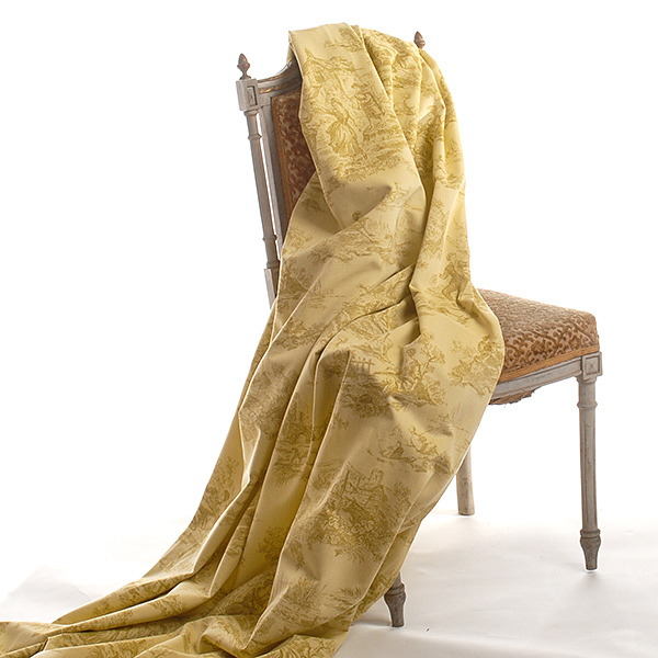 Látka s motivemtoile de jouy znázorňující scény z francouzského venkova ve žlutých barvách na pastelově žlutém podkladě. Látka kreton s potištěným vzorem toile je středně sílná s keprovou vazbou a jemným bavlněným povrchem. Metráž je vhodná i jakodekorační tkaninana závěs, přehoz či dekorační poslštáře.