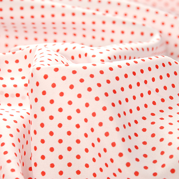 Látka na šaty - jemná látka se vzorem drobných červených puntíků na bílém podkladě. Látka je splývavá a neprůsvitná.