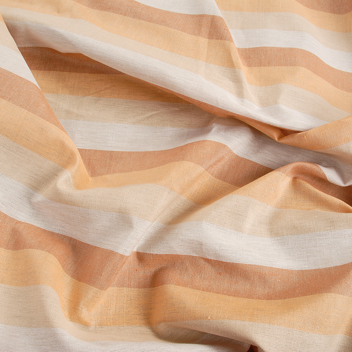 Len Art Fabrics širší pruhy světle hnědé lněná látka vyrobena ve vlastní tkalcovně firmy MarLen s charakteristickou lněnou strukturou, se vzorem pruhů světle hnědé, tmavě hnědé, světle žluté, béžové a světle šedé barvy . Len Art Fabrics širší pruhy světle hnědé lněná látka střední síly.
