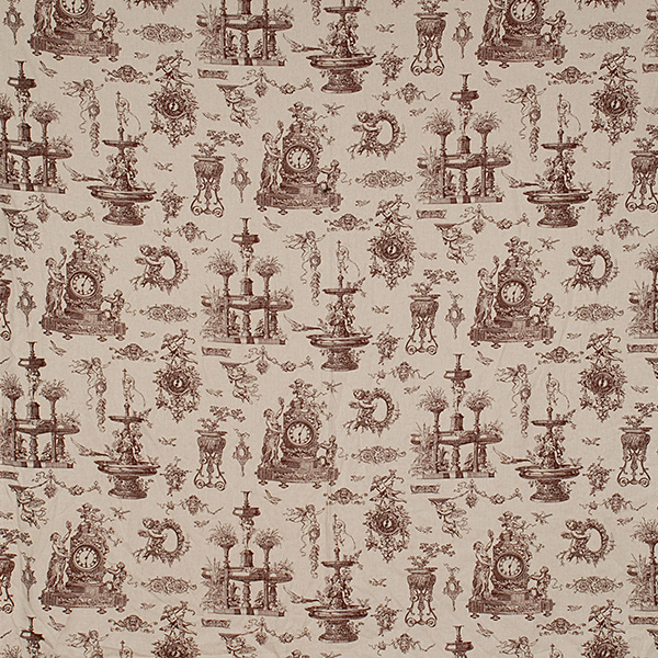 Lněná látka - látka metráž tisk barokní motiv andílků doplněna nejen květinovým vzorem v hnědé barvě na podkladu režné světlé barvy. Látka je středně silná s hrubší lěnou vazbou vhodná na splývavé volné šaty, sukni či halenu.