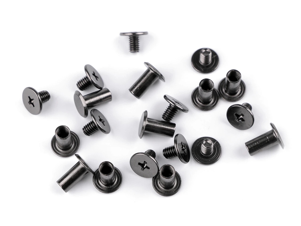 Nýt sřoubovací sedlářský hladký 6mm nikl černý kovový sedlářský šroubovací nýt je vhodný k výrobě tašky, kabelky, opasku a podobně. Nýt sřoubovací sedlářský hladký 6mm nikl černý skládá ze dvou kousků, které do sebe zašroubujete - může sloužit i ke spojení dvou kusů látek bez šití. Vhodné pro sílu materilálu 10 mm.