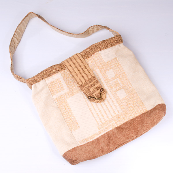 Originální taška šitá - v barvách smetanové, medové a hnědé. Každá z tašek je jedinečná svou barevnou kombinací a tvarem. Taška má podšívku s vnitřní kapsou. Je opatřena stahovací stužkou.