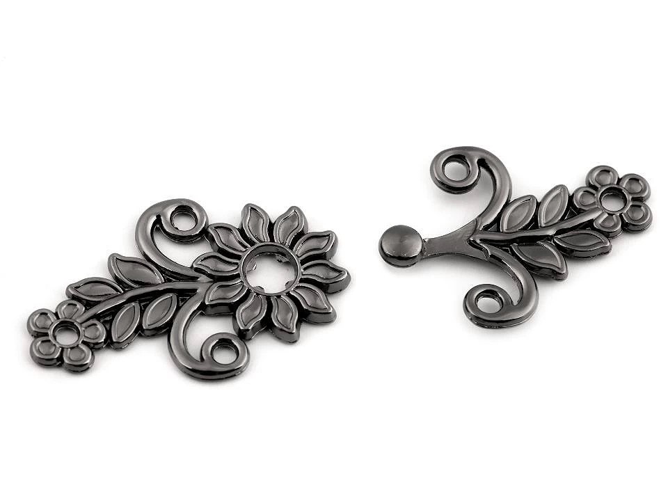 Ozdobné filigránové zapínání nikl černý 20x50mm- zdobné filigránové zapínání s romantickým vzorem a průvlakem v barvě nikl černá. Ozdobné filigránové zapínání nikl černý 20x50mm - zapínání je složeno ze dvou částí, které se do sebe zaháknou. Každý z dílů je potřeba přišít na daný kus modelu.