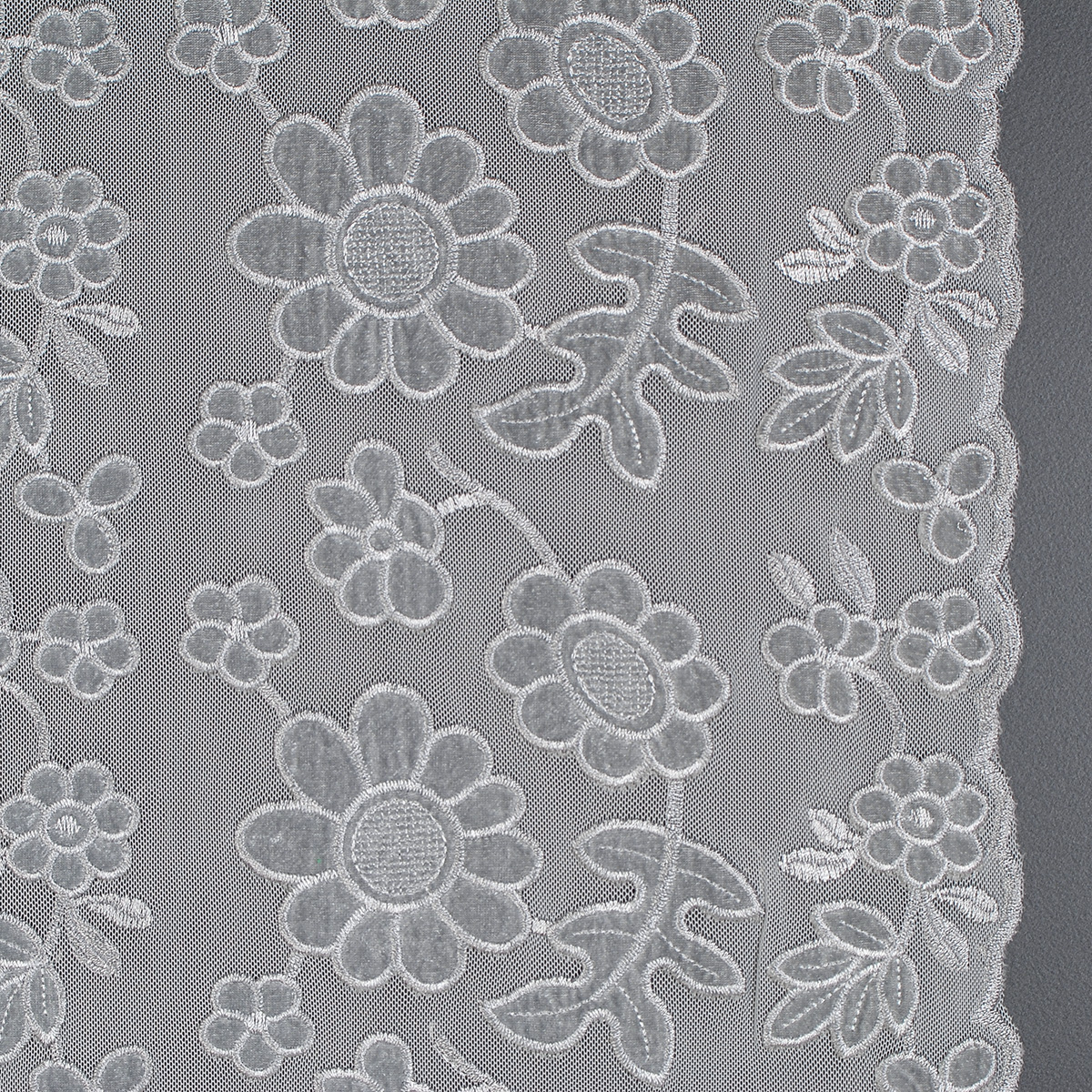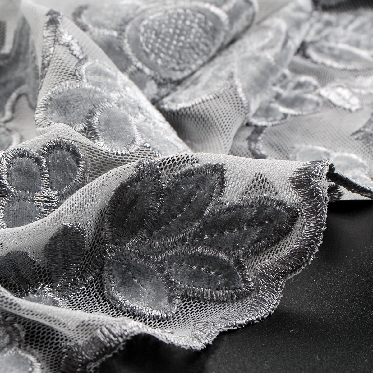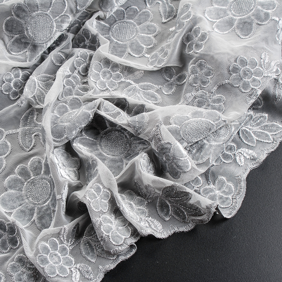 Pružná krajka sametová výšivka na tylu květy šedá - jemný pružný tyl doplněn výšivkou a sametovou aplikací s květinovým motivem ve světle šedé barvě.
