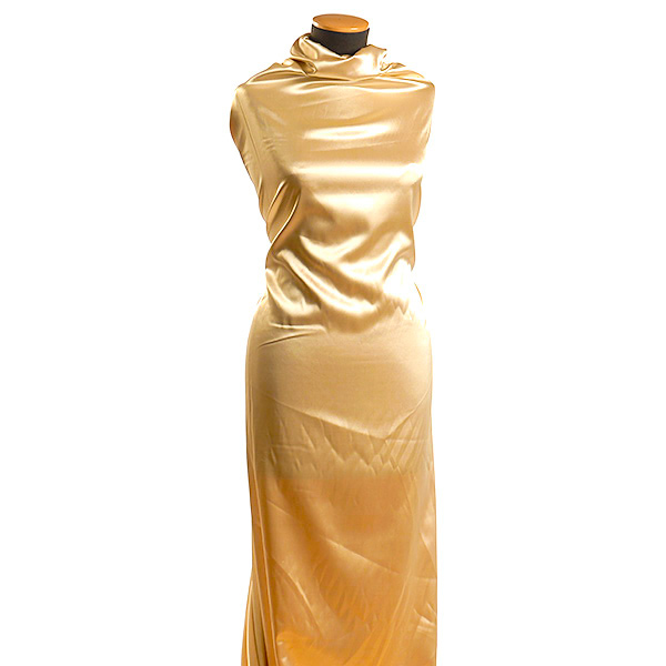 Pružný hladký satén - látka s jemným hladkým povrchem zlaté barvy. Látka má charakteristický saténový lesk, je pružná, splývavá a neprůsvitná.