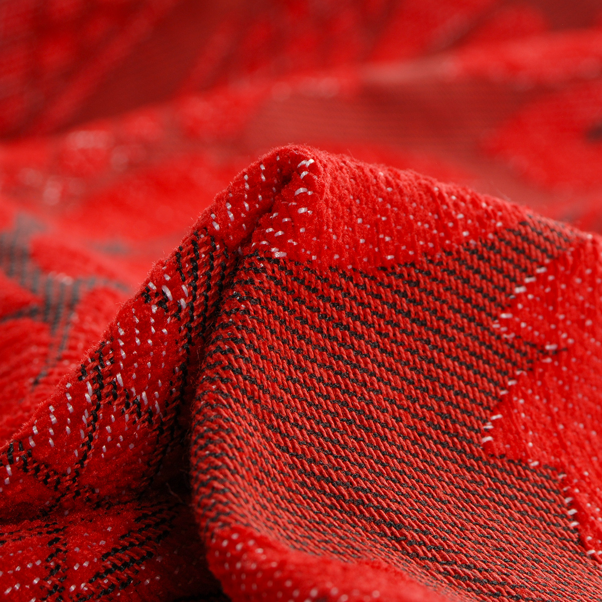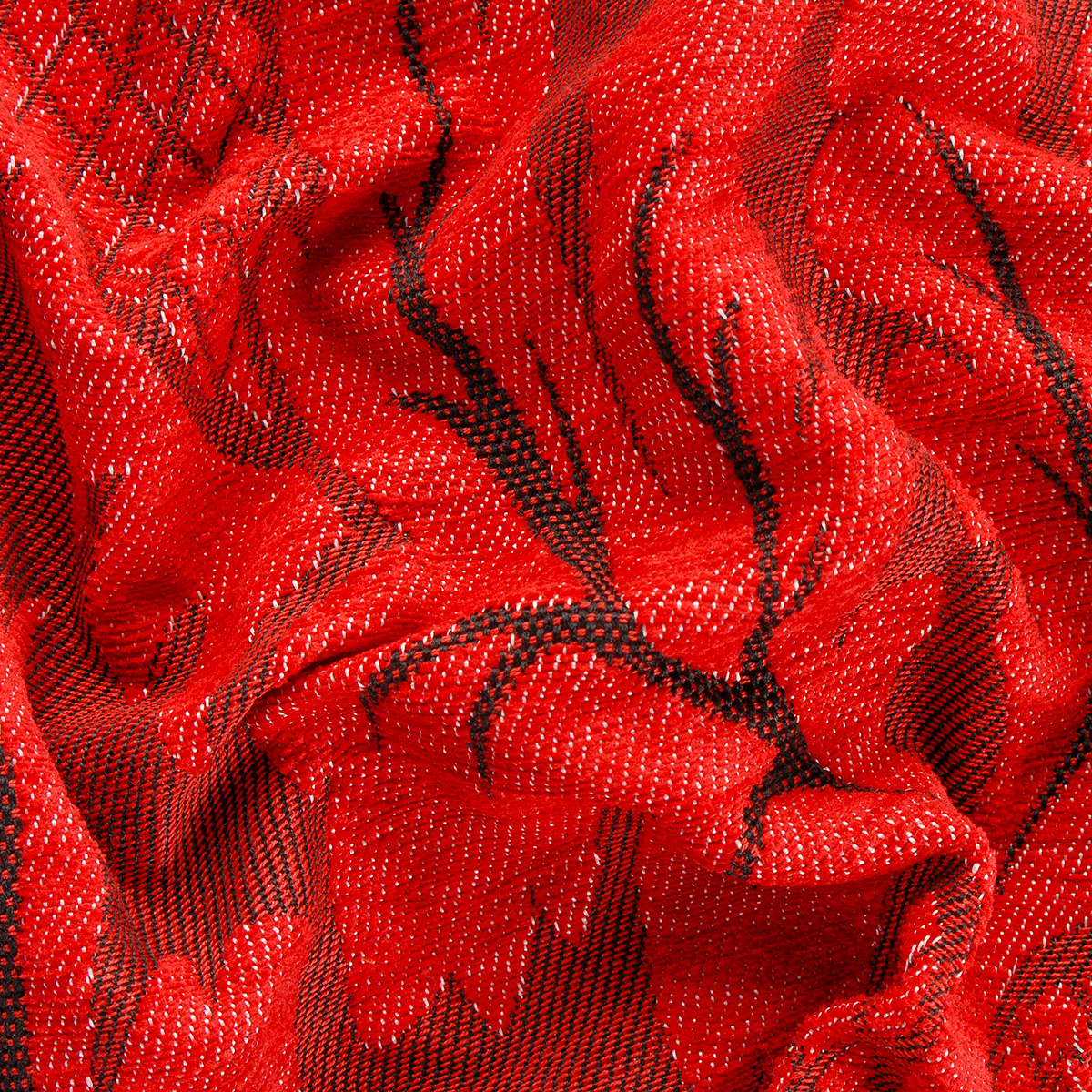 Replika historické látky- žakárová dekorační tkanina s rokokovým vzorem v červené barvě na červenočerném podkladě. Látka má povrch podobný sametu, je vyrobena z žinylkové příze a ji použít i na historické šaty z období rokoka. Replika historické tkaniny byla vyrobená v naší vlastní tkalcovně na Vysočině.