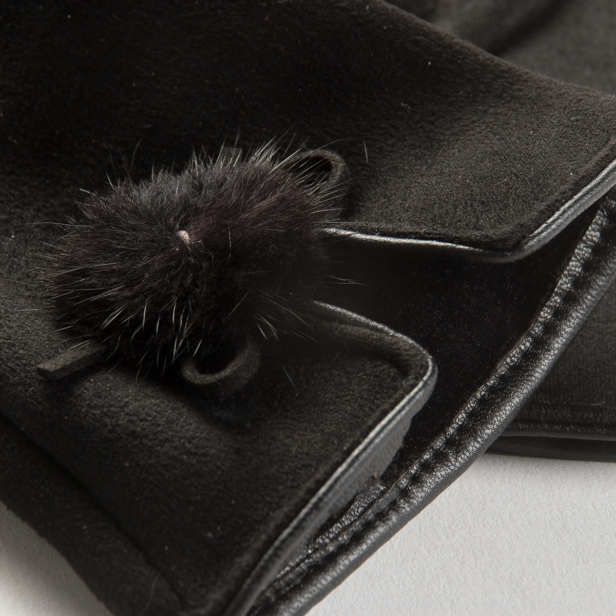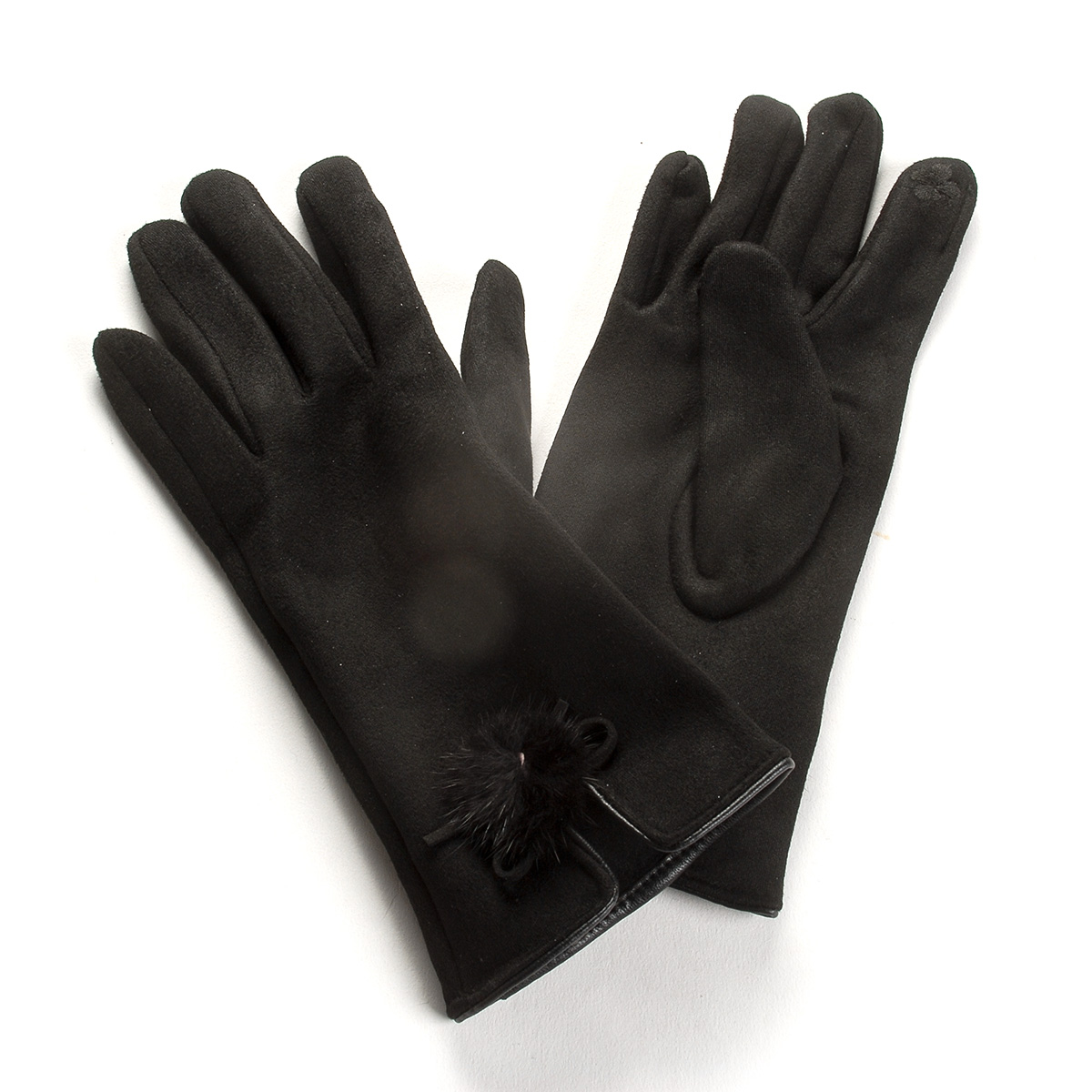 Rukavice dámské imitace kůže zateplené černé S/M - elegantní dámské rukavice imitiace broušené kůže v černé barvě doplněna kožíškovou podšívkou, bambulkou a dotykovou úpravou. Rukavice dámské imitace kůže zateplené černé - rukavičky jsou díky plyšové podšívce hřejivé a příjemné na omak, látka je lehce pružná a díky ní hezky padnou na ruku.