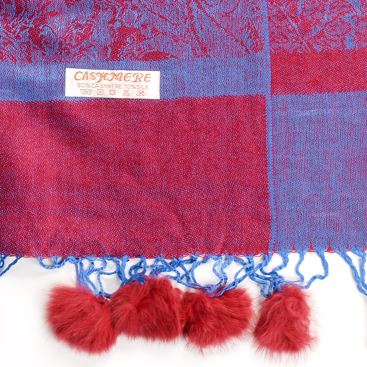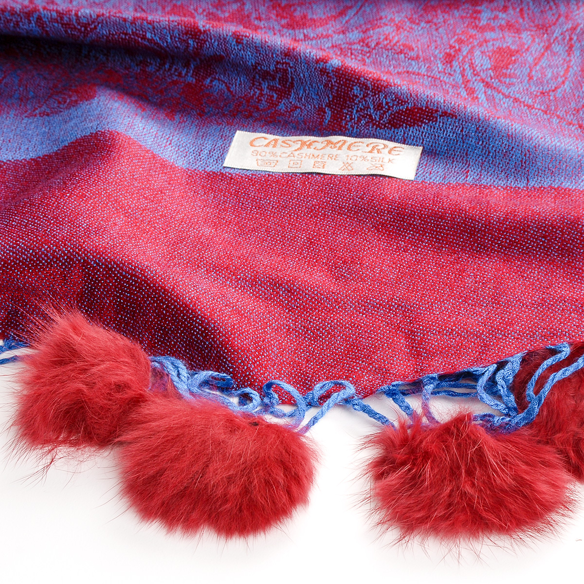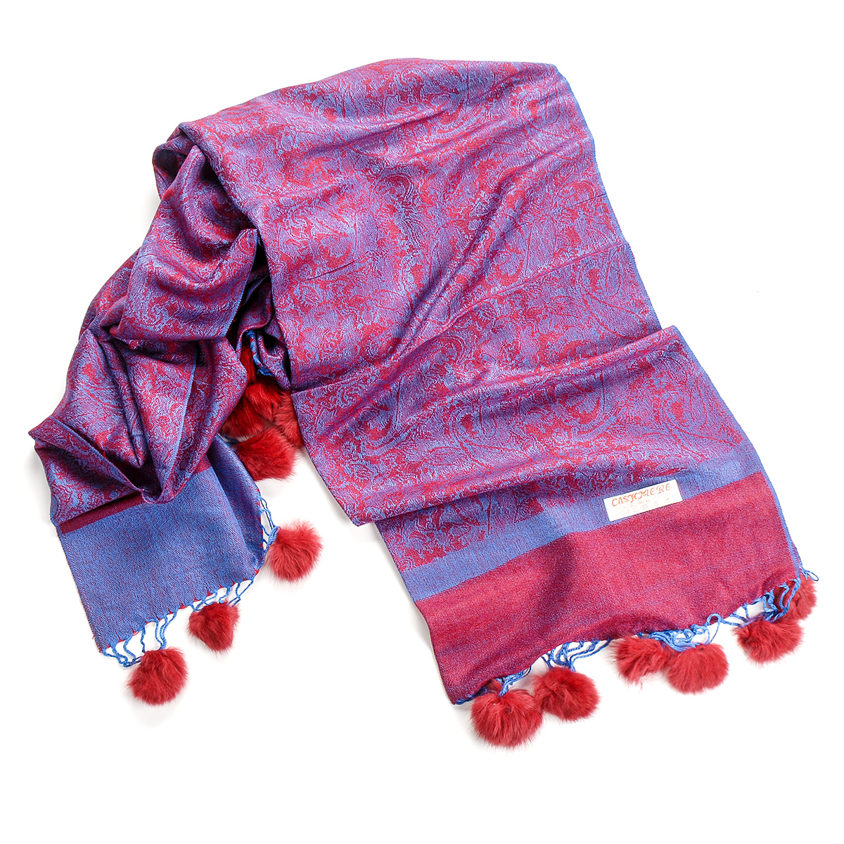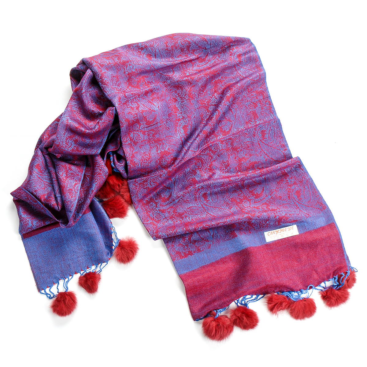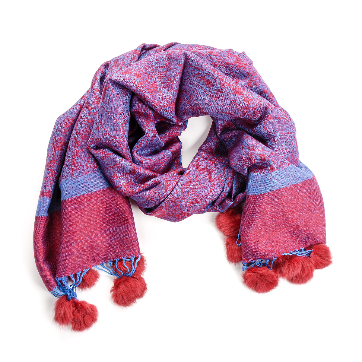 Elegantní teplá šála s kožešinovými bambulkami směs vlna kašmír s hedvábím a žakárovým paisley vzorem v modrovínové barvě. Śála je zakončena malými bambulkami, je měkka a hebká na omak, je velmi hřejivá a vzor je oboustranný.