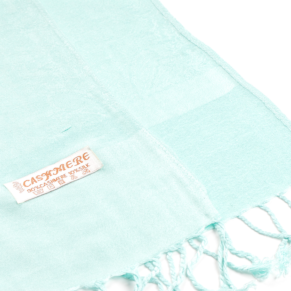 Elegantní teplá šála s třásněmi směs vlna kašmír s hedvábím a žakárovým paisley vzorem v pastel světle tyrkysové mint barvě. Śála je zakončena třásněmi, je měkka a hebká na omak, je velmi hřejivá a vzor je oboustranný.
