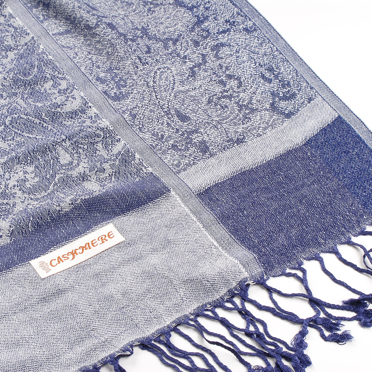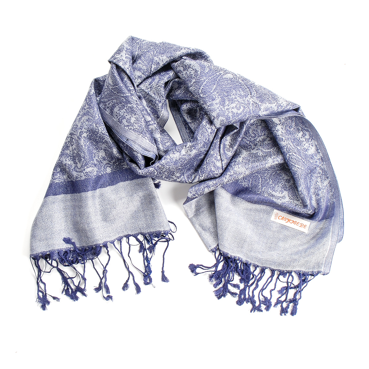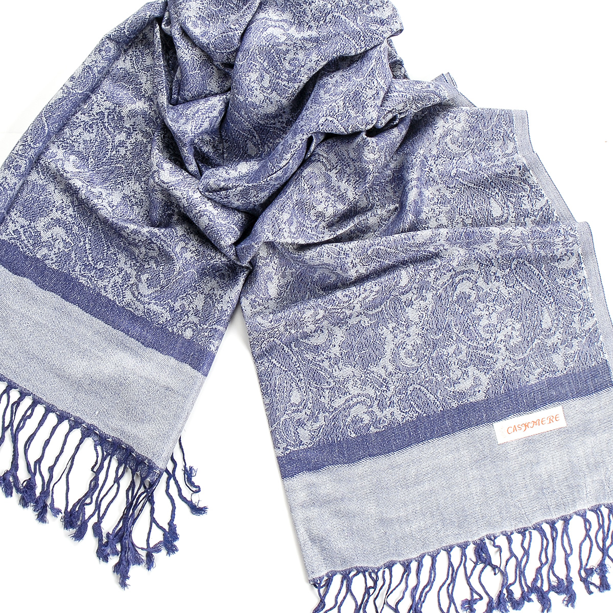 Elegantní teplá šála s třásněmi směs vlna kašmír s hedvábím a žakárovým paisley vzorem v barvě světle i tmavě modré. Śála je zakončena třásněmi, je měkka a hebká na omak, je velmi hřejivá a vzor je oboustranný.