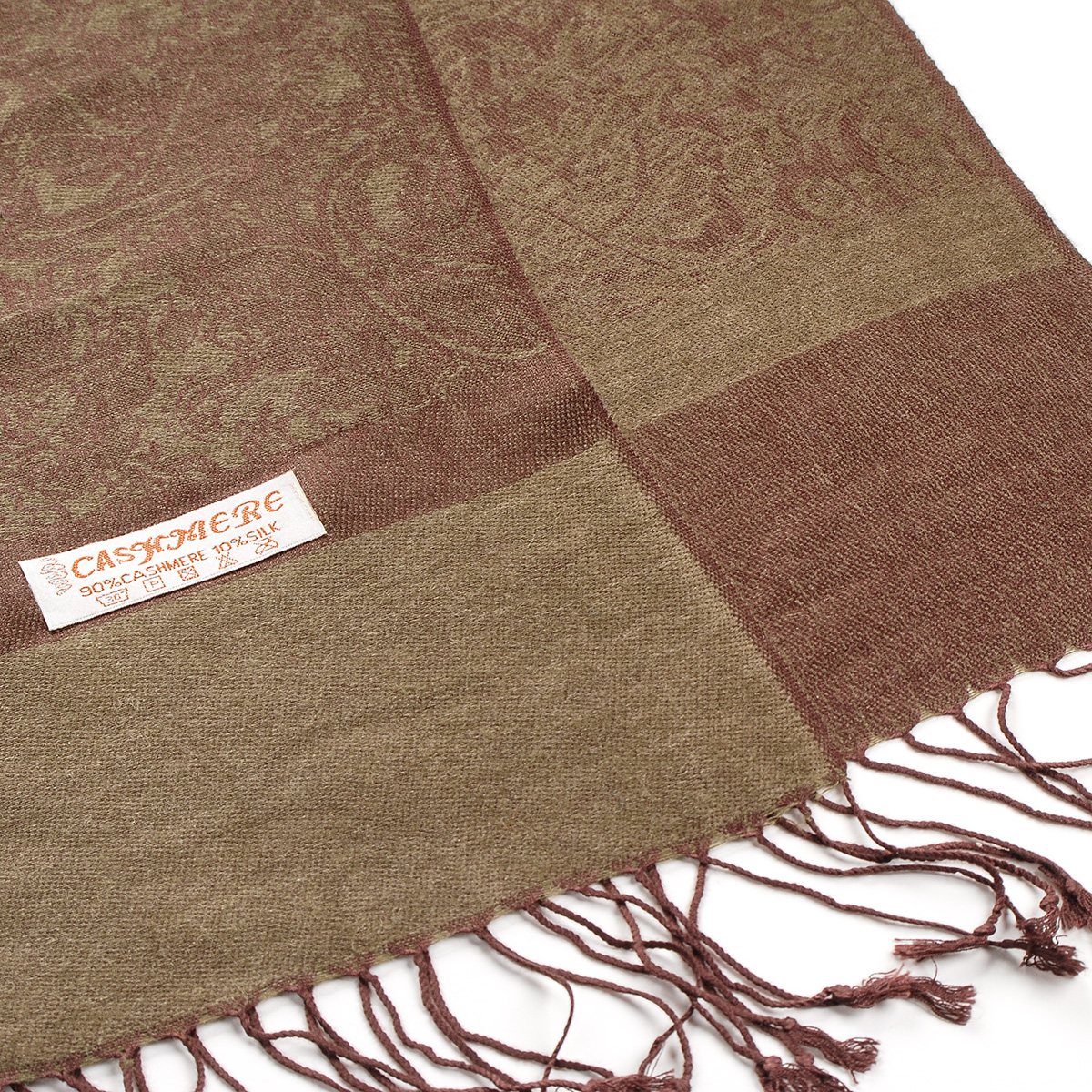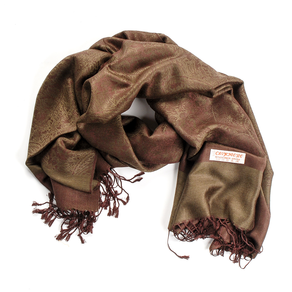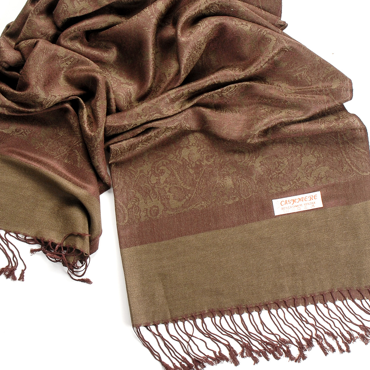 Elegantní teplá šála s třásněmi směs vlna kašmír s hedvábím a žakárovým paisley vzorem v tmavě hnědé barvě s nádechem do zelenohnědé. Śála je zakončena třásněmi, je měkka a hebká na omak, je velmi hřejivá a vzor je oboustranný.