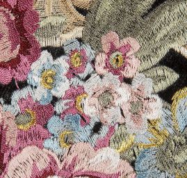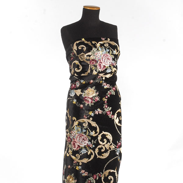Samet s barokní květinovou výšivkou černý - těžký samet s lesklým vlasem s barokní květinovou výšivkou ve francouzském stylu v barvách černé vínové, smetanové, béžové a zelené doplněna zlatým vláknem. Samet s barokní květinovou výšivkou černý je pevná tkaná látka, s lehce plastickou výšivkou a lesklým vlasem, působí velmi elegantně.