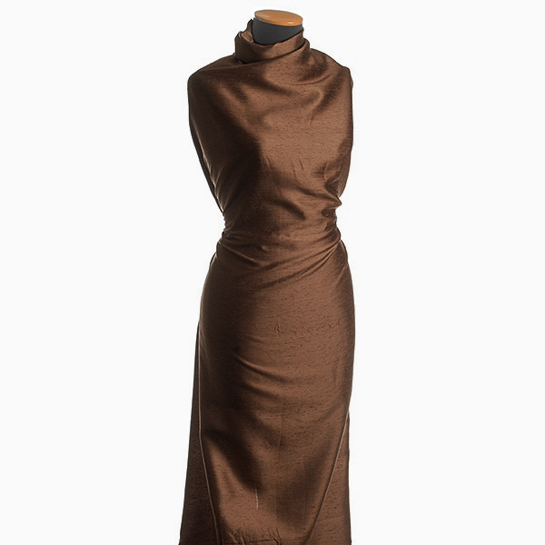 Šantunghedvábná látka - tmavě hnědé barvy má svou charakteristickou strukturou s vetkanými nopky, uzlíčky a svým efektním leskem. Exkluzivní hedvábná metráž patří k tomu nejlepšímu, co můžeme nabídnout. Při šití uváženě volte střih oděvu, doporučujeme použít podšívku a dobře zpracovat švy namáhané pnutím (určitě podlepte). Metrový textil je dostupný na obou našich pobočkách - Praha, Brno.