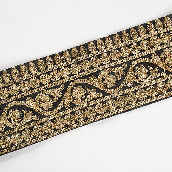 Šantungová stuha široká ornamentální vzor-stuha rozdělěná vzorem do čtyř polí s květinovým motivem vašitým zlatou rexovou nití,na černém podkladu.Šantungová stuha široká ornamentální vzor neboli textilní porty borty jsou vhodné na dozdobení oděvu. Oceníte je určitě při šití nevšedních svatebních šatů, renesančního historického dobového kostýmu nebo zdobení tašky, klobouku a podobně.