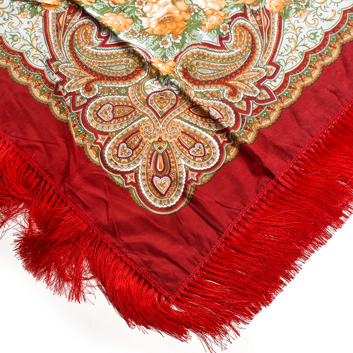 Šátek bavlna tisk folklórní vzor 130x130cm vínový - elegantní šátek s lidovým folklórním krojovým motivem velkých květů a paisley kašmírového vzoru doplněn třásněmi ve vínovém podkladě. Šátek bavlna tisk folklórní vzor 130x130cm vínový- šátek splývavý, neprůsvitný a tisk je pouze z jedné strany.