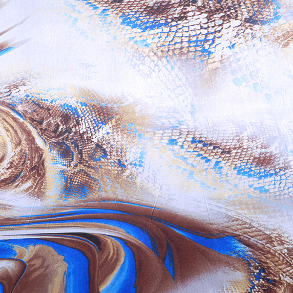 Efektní vzorový satén - látkas abstraktním zvířecím vzorem v hnědých a modrých barvách na bílém podkladě. Vzor je digitálně tištěn na jemnou splývavou látku imitující hedvábí. Látka lehce pruží svou vazbou.