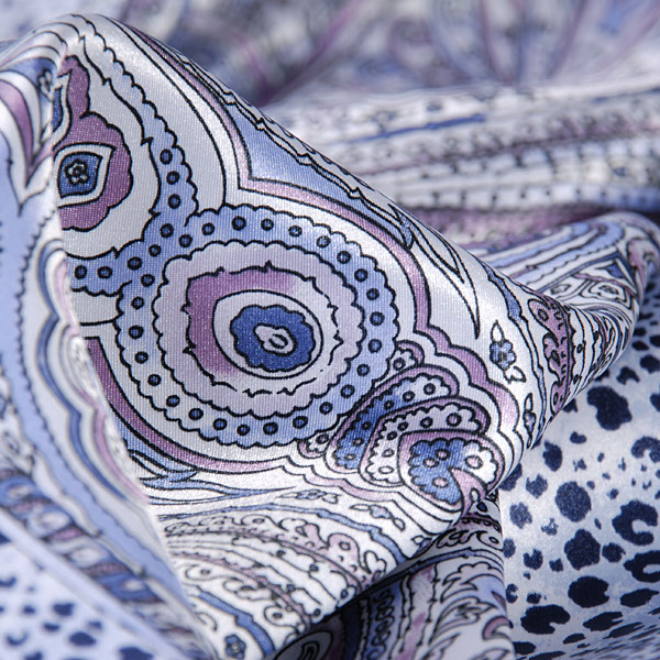 Efektní látka metráž satén - jemný satén v barvách modré, fialkové a bílé se zvířecím motivem a kašmírovou bordurou. Látka je splývavá, nemačká se a má klasický saténový lesk.