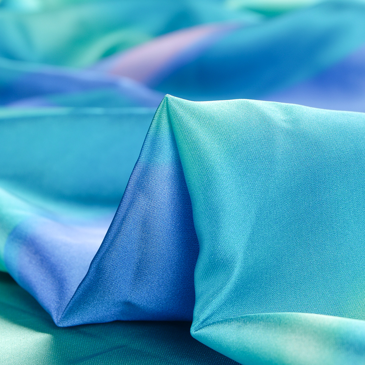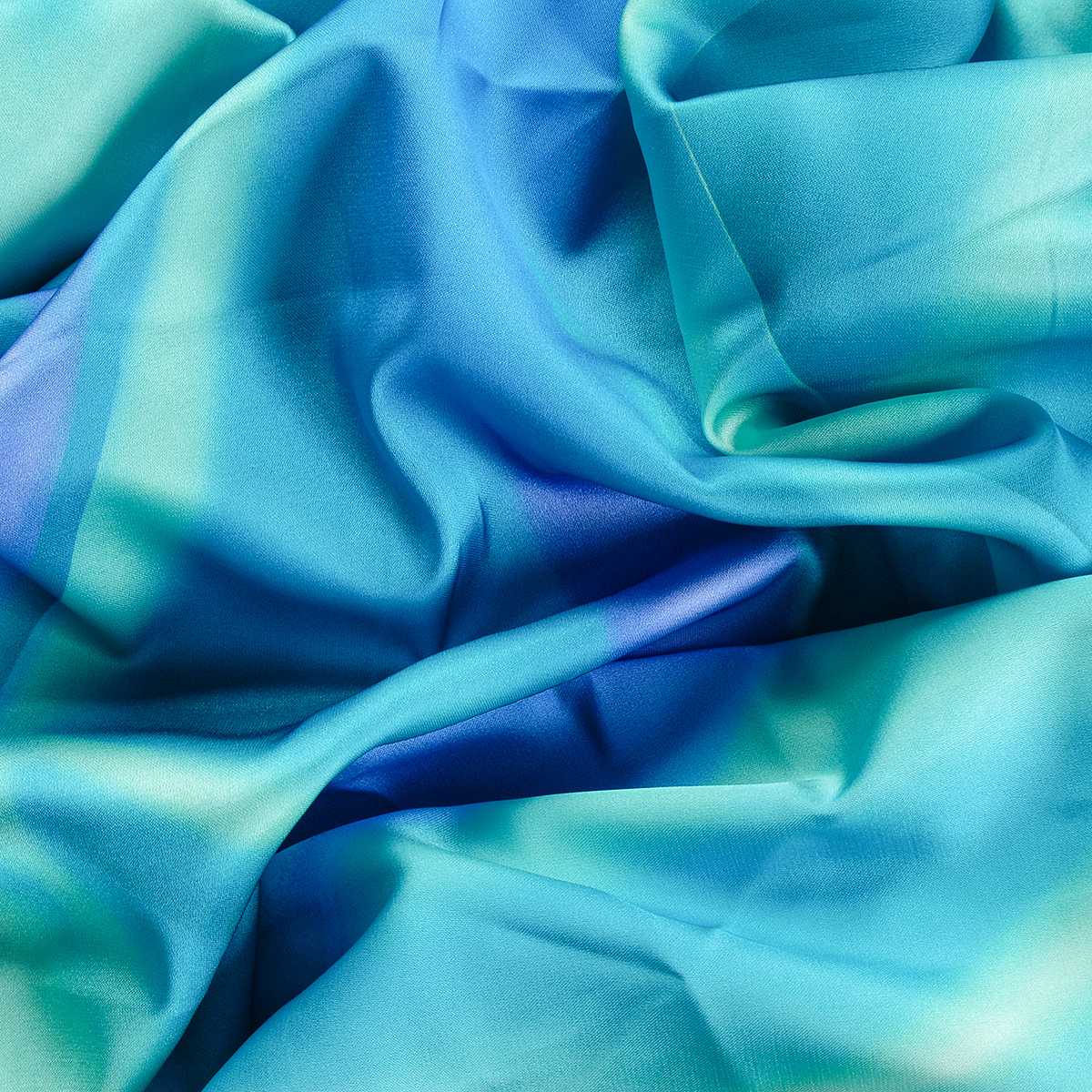 Jemný pružný satén imitace hedvábí s abstraktním vzorem v pastelových barvách tyrkysové, smaragdově zelené, fialové a modré. Látka má jen lehce lesklý povrch, spíše působí matněji oproti běžným saténům, je bohatě splývavá, je velmi příjemná na omak a není průsvitná.