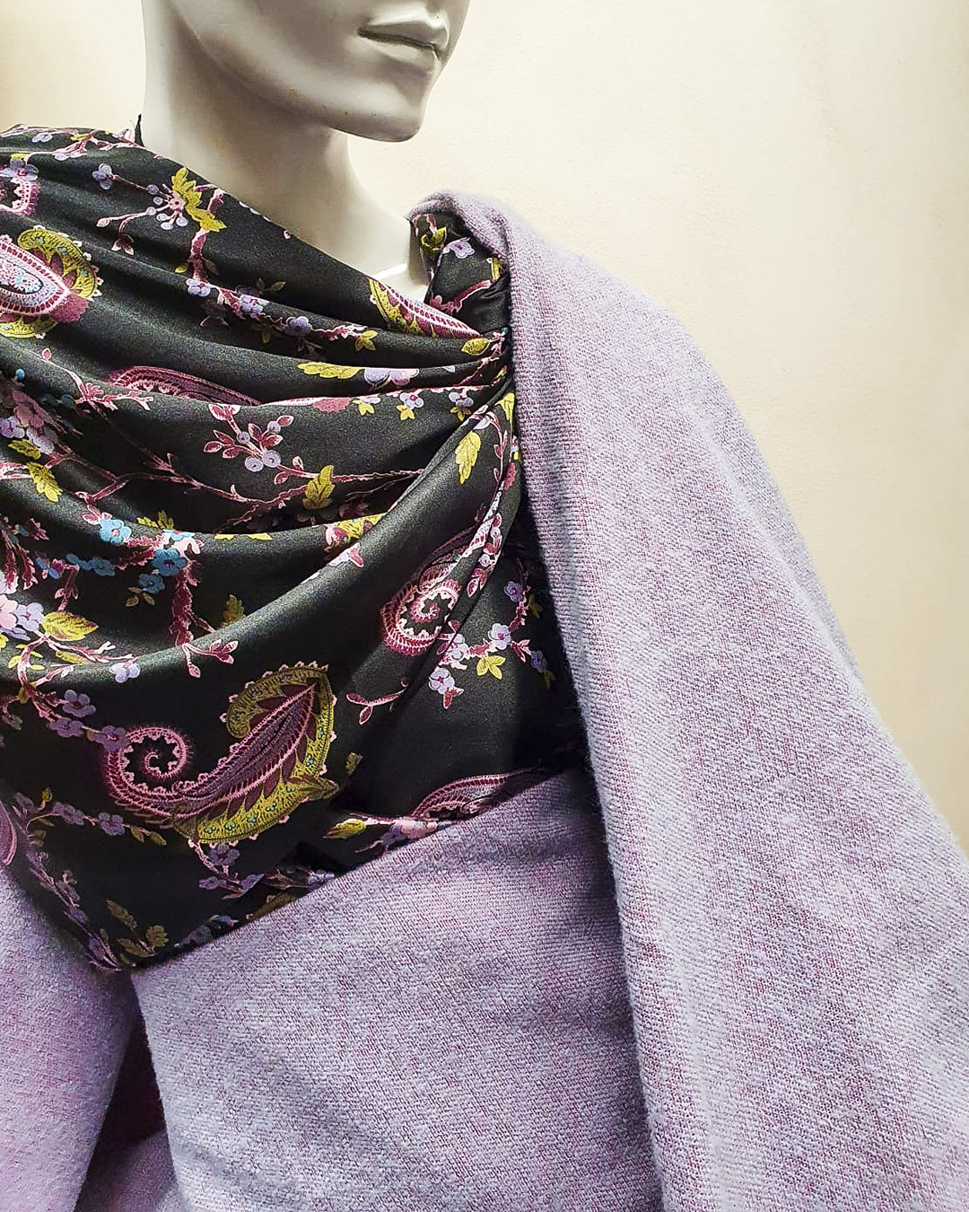Satén vzor nepružný - látka s kašmírovým paisley vzorem doplněným květinami v barvách černé, růžové, modré a zelené. Vzor je digitálně tištěn na splývavou, lehkou a nepružnou látku.