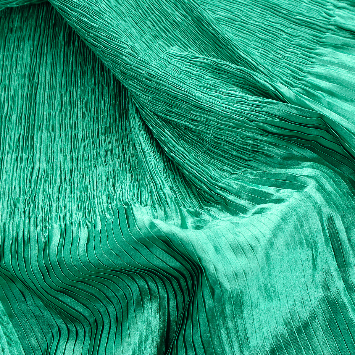 Satén plise zelený jemná saténová látka s úpravou plise/žabičky v tmavší zelené barvě. Satén plise zelený je splývavá látka, s charakteristickým lesklým povrchem a příjemná na omak.
