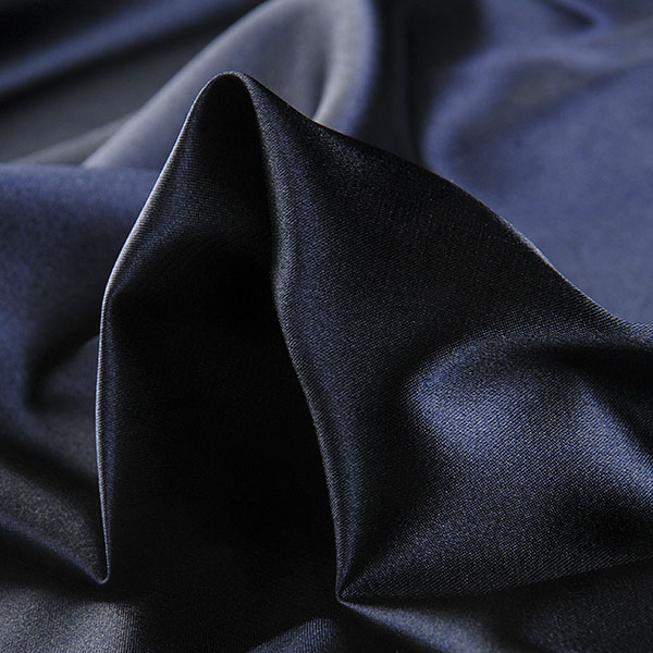 Pružný satén jemný v tmavě modré barvy. Saténová látka má charakteristický vzhled lesklého povrchu z líce a matného povrchu z rubové strany, látka je pružná, splývavá a neprůsvitná.