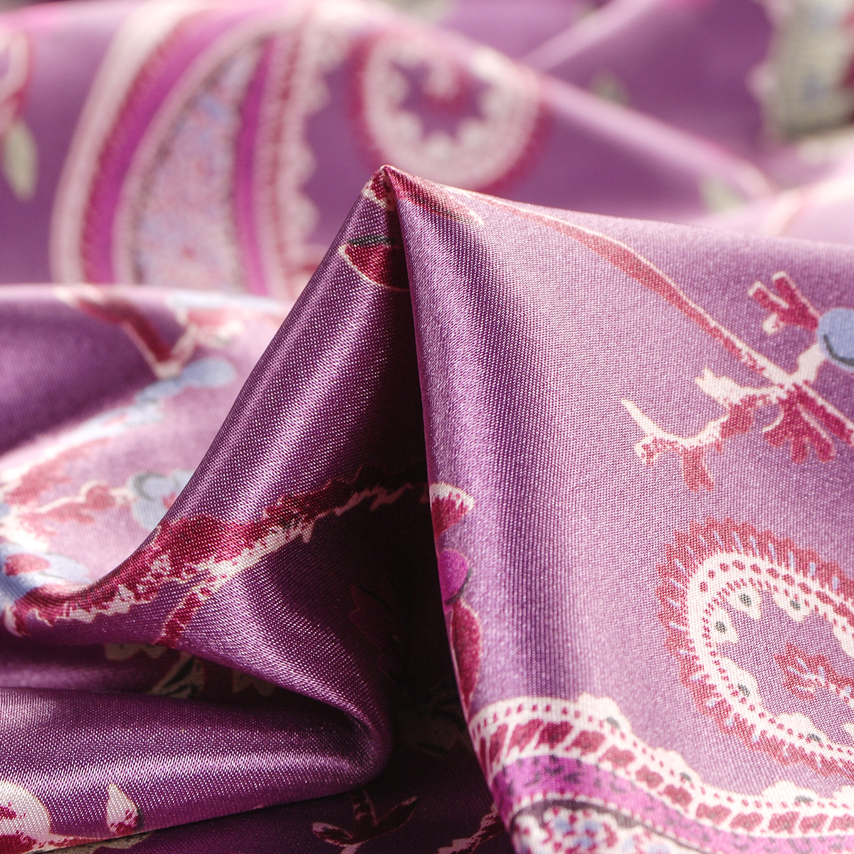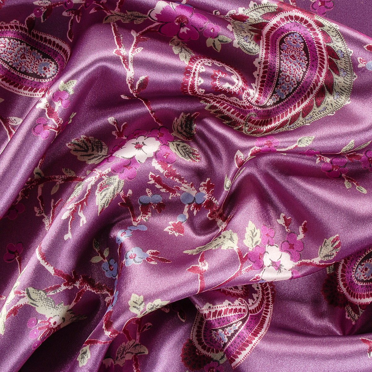 Satén vzor nepružný - látka imitace hedvábí s kašmírovým paisley vzorem doplněným květinami v barvách fialové, vínové, růžová a béžová. Vzor je digitálně tištěn na splývavou, lehkou a nepružnou látku.
