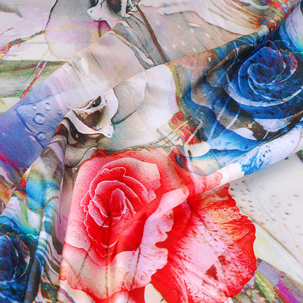 Efektní vzorový satén - látka se vzorem růží na mramorovém podkladě. Růže jsou v jasně červených, khaki zelených, hnědých, modrých a fialových barvách na smetanovém podkladě. Vzor je digitálně tištěn na splývavou a nepružnou látku.