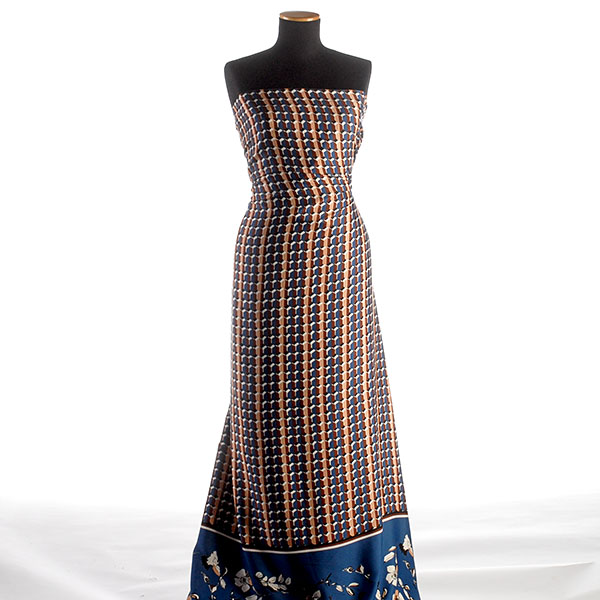 Šatová látka imitace hedvábí modrohnědá šatová látka imitující jemné hedvábí s geometrickým vzorem a květinovou bordurou modrohnědé barvy. Šatová látka imitace hedvábí modrohnědá látka má matný povrch, je hladká a příjemná na omak, je splývavá, není pružná a průsvitná.