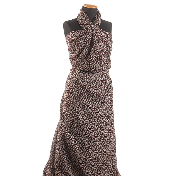 Jemný šifón vzor - látkas motivem drobných květů v bílé barvě na hnědém podkladě. Metráž je lehce pružná, splývavá a průsvitná.