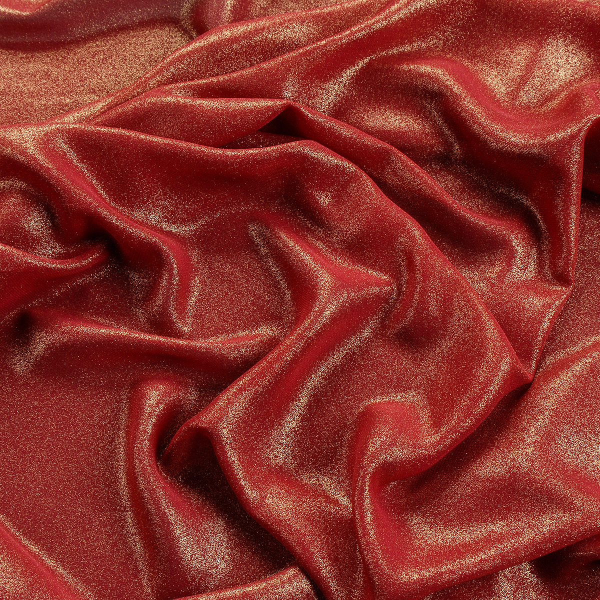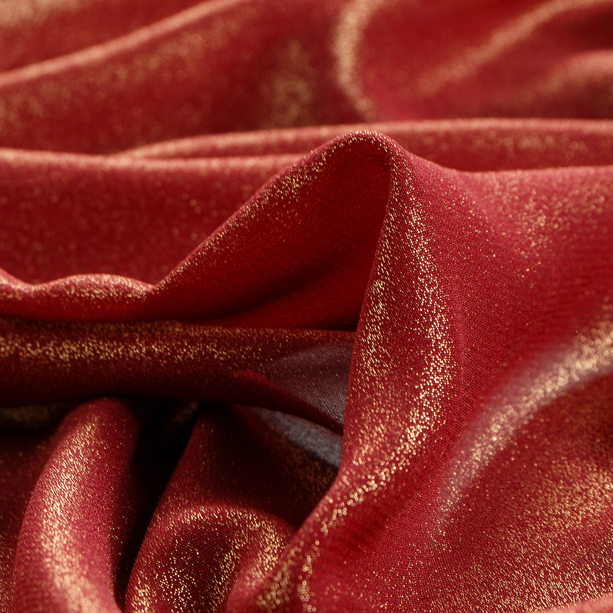 Šifon lamé černozlatý jemná šifonová látka imitující mušelínové hedvábí se zlatým lamé efektem a s vysokým leskem na podkladové vínové barvě. Šifon lamé černozlatý je vzdušná a splývavá.