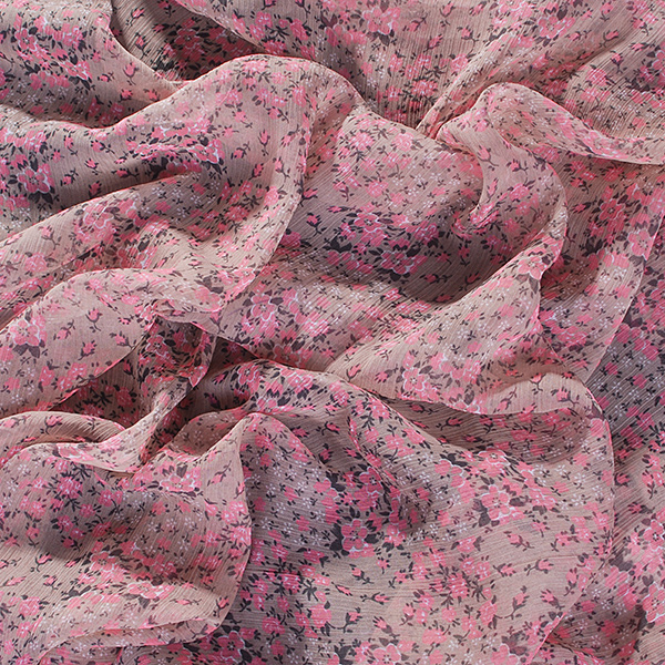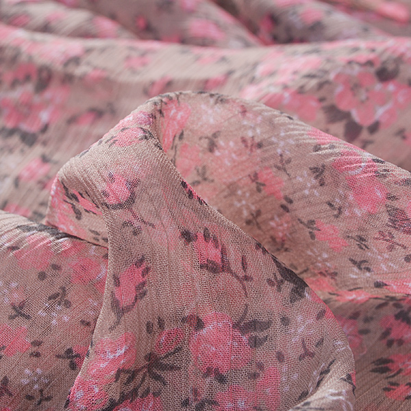 Efektní šifon plise společenská látka -jemný šifon vzor drobných květů v barvách starorůžové, tmavě hnědé a smetanové na béžovohnědém podkladě. Metráž je splývavá, vzdušná a pružná svou vazbou.