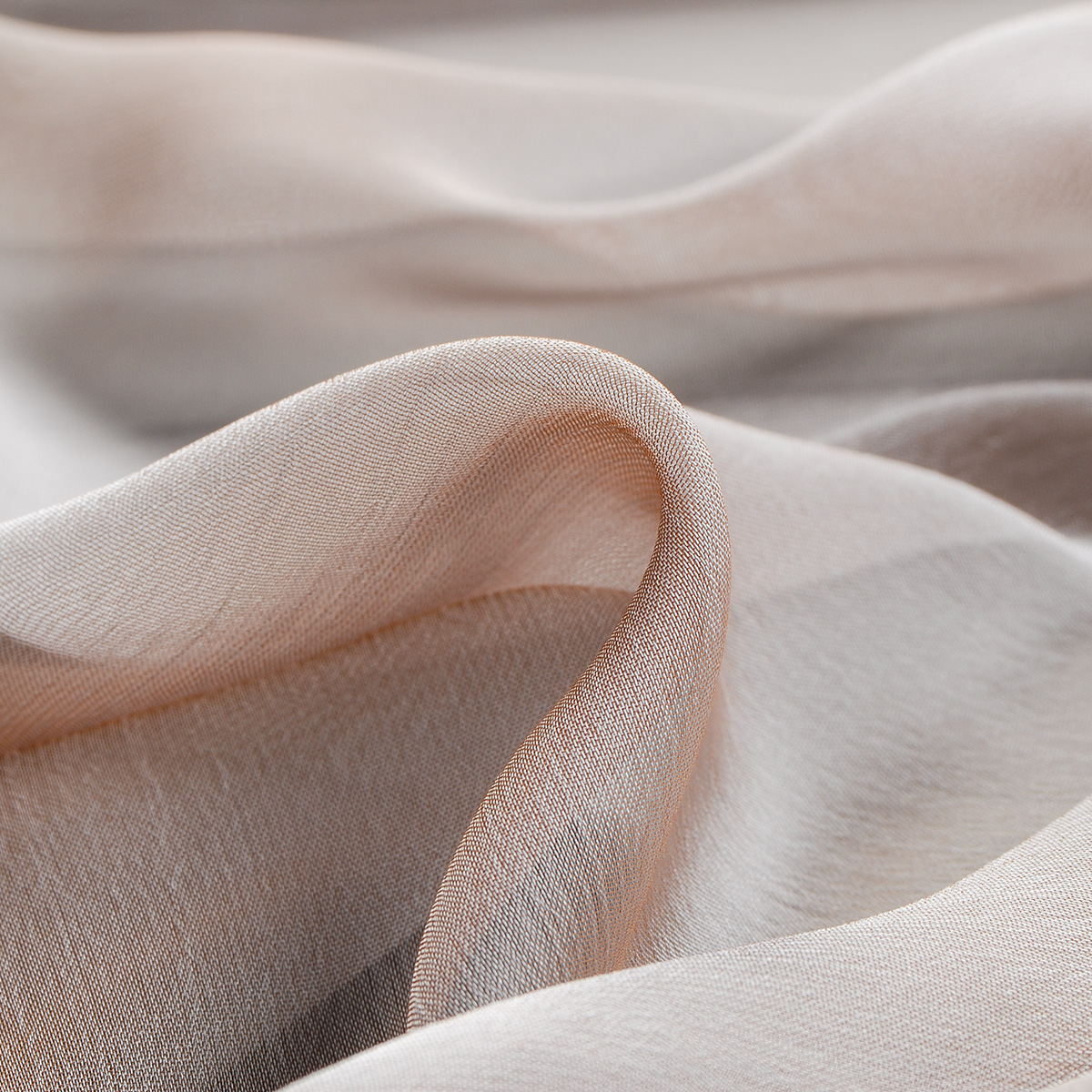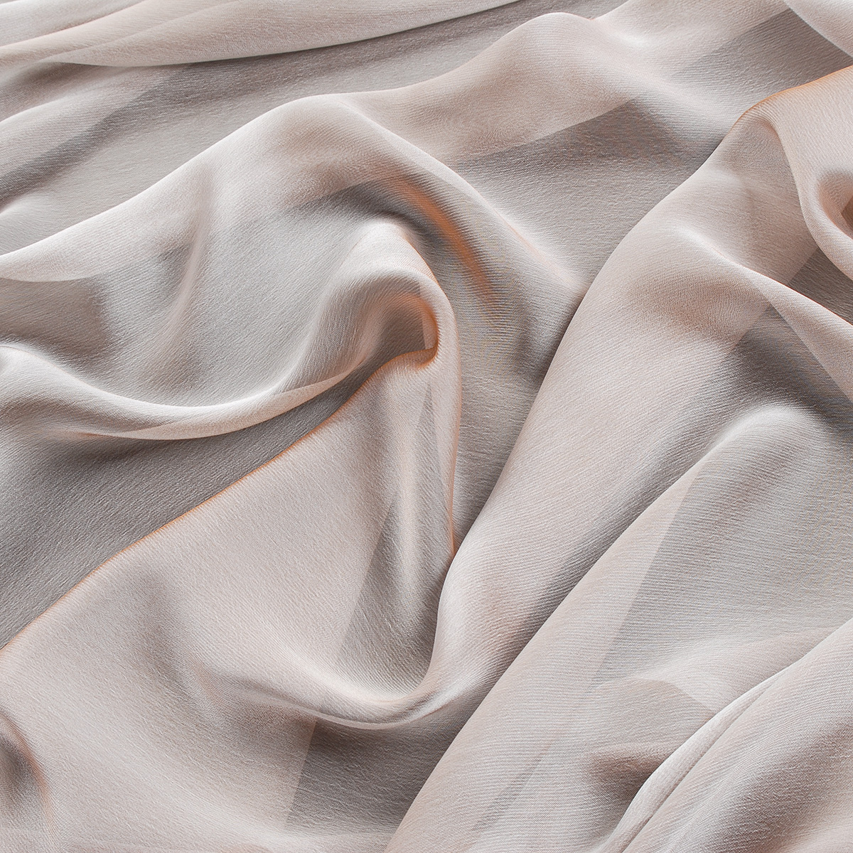 Tato jemná šifonová látka v provedení šanžán vás okouzlí svým měňavým efektem v pastelových tónech béžovohnědé barvy. Materiál věrně imituje luxusní mušelínové hedvábí a vyznačuje se elegantním lesklým povrchem. Díky plisé úpravě získává tato metráž lehce plastický vzhled, je mimořádně vzdušná a krásně splývavá.