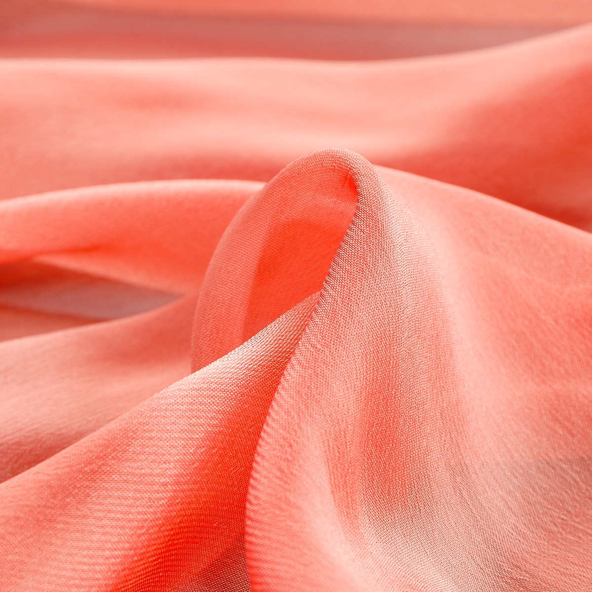 Jemná látkašifon šanžán imitující mušelínové hedvábí s lesklým povrchem v barvě oranžovočervené. Šifonová látka je vzdušná a splývavá, má lehce plastický povrch s plise úpravou.