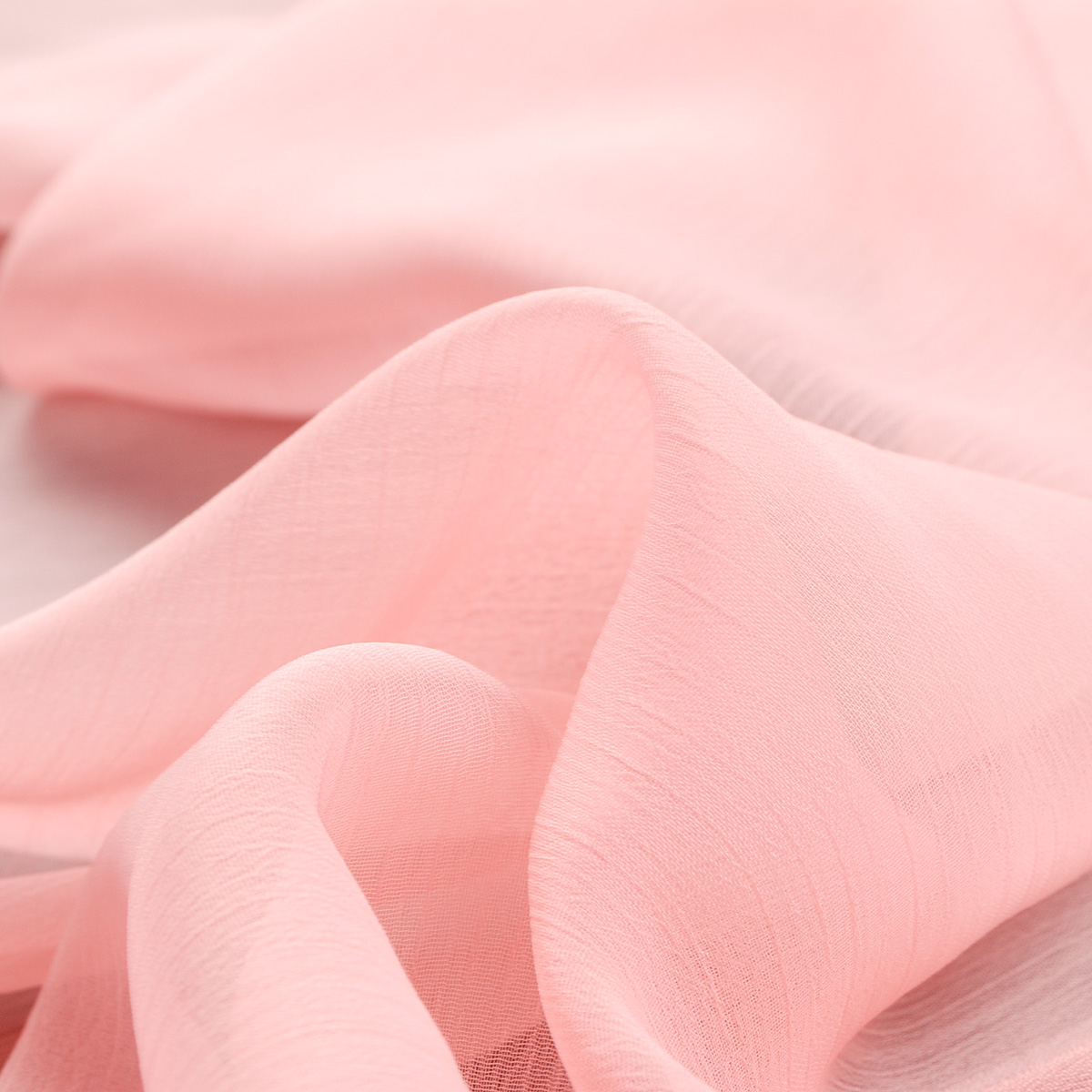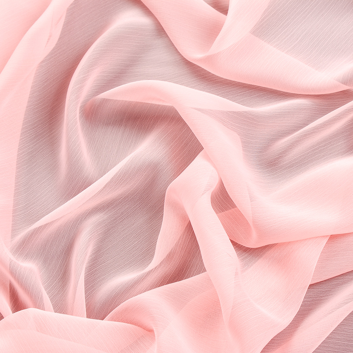 Jemná látkašifon šanžán imitující mušelínové hedvábí s lesklým povrchem v barvě lososové. Šifonová látka je vzdušná a splývavá, má lehce plastický povrch s plise úpravou.