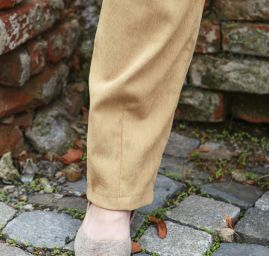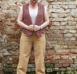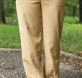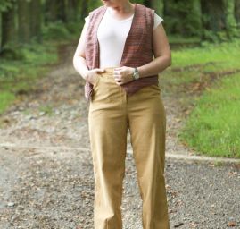 Celkovo som sa inšpirovala modelom č. 116 zo strany č. 29 a k nohaviciam som si ušila rovno aj vestičku. Pre nohavice sme s pani Lenkou z MarLen zvolili pružný menčester s úzkymi prúžkami v pieskovej farbe. Tento menčester sa šije veľmi dobre, ale pri žehlení je treba dávať pozor a mať žehličku nastavenú skôr na menšiu teplotu, aby sa vám nespálili spandexové vlákna. Látka by sa vám mohla zvlniť a vyťahať. Určite je lepšie na skúšku prežehliť najskôr odstrižok, než sa pustíte do žehlenia hotového modelu.