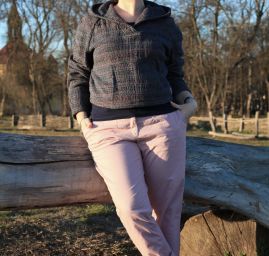 Zakaždým v Burde nájdem nejaký kúsok, ktorý ma zaujme a ja sa môžem pustiť do šitia. Za marec (Burda 03/2023) ma najviac oslovila croptop mikina s kapucňou na str. 18/2023. V origináli je ušitá z pružnej látky, ja som ale po porade s pani Lenkou z MarLen skúsila zaexperimentovať a vybrala som si tkanú látku z kolekcie Art fabrics.