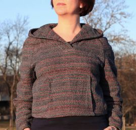 Strih na mikinu je oversize a mikina je v dĺžke crop-top, čo je dnes dosť módne. Aj napriek tomu som pre istotu zvolila strih o jednu veľkosť väčší ako by som volila pri šití z pružnej látky. Vďaka kapucni vsadenej do véčkového výstrihu je priekrčník dostatočne veľký, aby sa mikina dala pretiahnuť cez hlavu. Raglánové rukávy zaisťujú pohodlie v miestach prieramkov.
