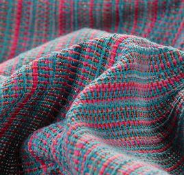Táto látka je utkaná na Vysočine v tkáčovni MarLen a má vzhľad ako ručne tkaná. Nezabudnite ju pred šitím vyprať: veľa zmení vzhľad (k lepšiemu ;-) a zmäkne. Štruktúra látky je ľahko plastická, pretože obsahuje rôzne silné nitky ružovej, tyrkysovej, šedej a zlatej farby. Látku nájdete pod názvom „chanel“ v niekoľkých rôznych farebných kombináciách. A ja vám tu ukážem, že nie je potrebné z nej šiť iba chanel kabátiky – obstojí aj ako látka na mikinu a dosť dobre si ju dokážem predstaviť napríklad aj na sukni či etno šortkách.