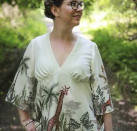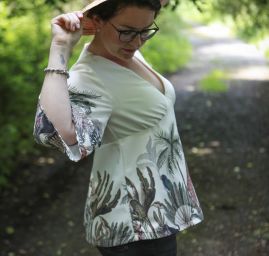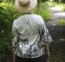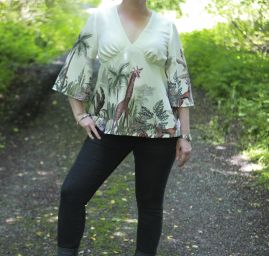 Pri listovaní staršími číslami Burdy som natrafila na strih, ktorý mi ihneď padol do oka. Je to model č. 111 z Burdy 02/2021. Motív džungle som napolohovala vždy k spodnému okraju predného a zadných dielov a taktiež rukávov. Pri ramenách a výstrihu som použila iba krémovú časť látky. Celá tunika je veľmi vzdušná a splývavá, tlačený motív pri spodných okrajoch tak krásne vynikol.