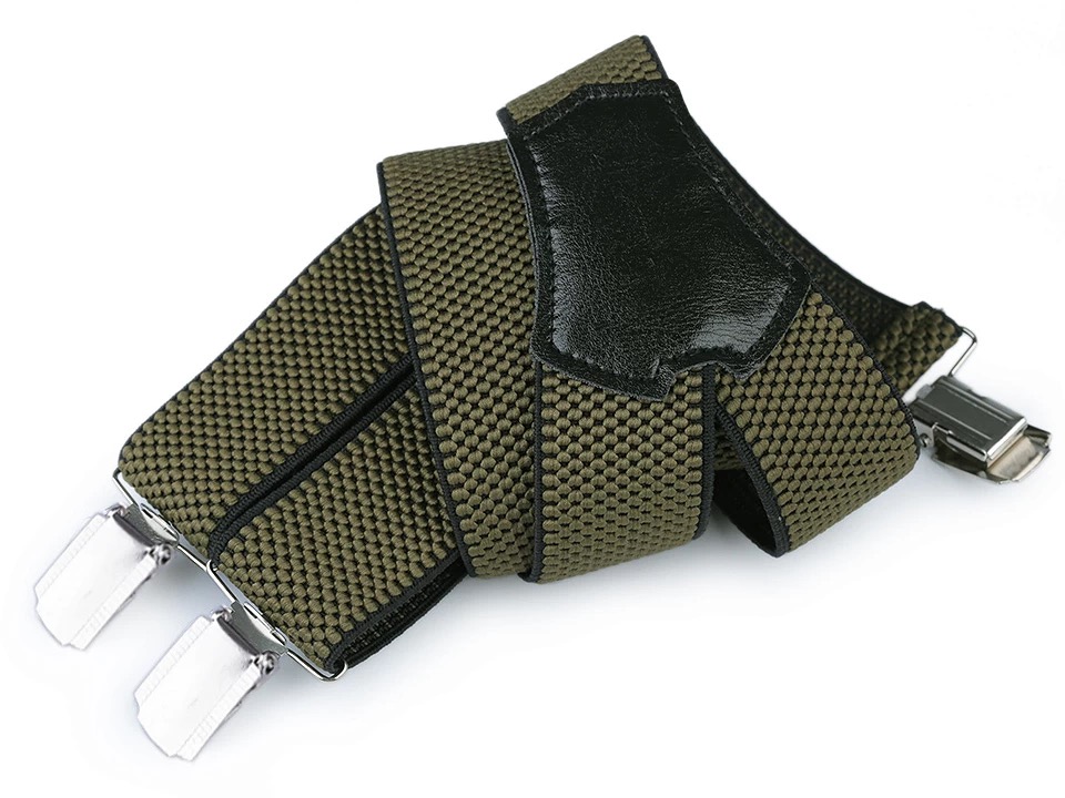 Šle pánské šíře 3,5 cm délka 120cm typ Y khaki elegantní pánské šle vzor Y jednobarevné z hrubším povrchem v khaki zelené barvě.Šle pánské šíře 3,5 cm délka 120cm typ Y khaki kvalitné šle vyrobeny v České republice, vsada v zadní části je z eko kůže a ke kalhotům se přichytí pomocí žabky (tři kusy, kov - dvě v přední části a jedna v zadní části). Design šlových závěsů se může mírně lišit.