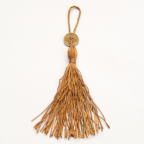 Střapce mince malý zdobný textilní střapec s kovovou čínskou mincí pro štěstí v hnědé barvě.
