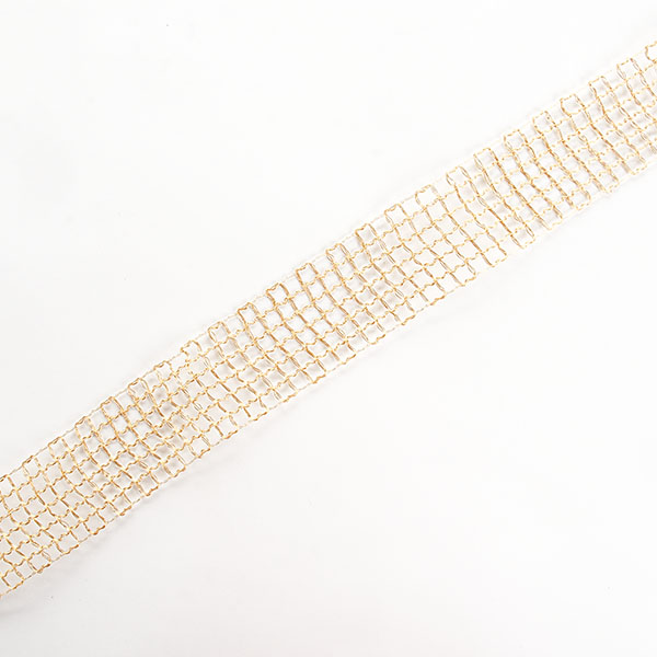 Stuha krajková kovová mřížka zlatá vzdušná krajková stuha s geometrickým vzorem mřížk z kovového vlákna zlaté barvy.Stuha krajková kovová mřížka zlatá je oboustranná, má svou patinu, je vhodná na dozdobení oděvu nevšedních spoločenských šatů, orientálního kostýmu nebo na dozdobení tašky, klobouku a podobně.