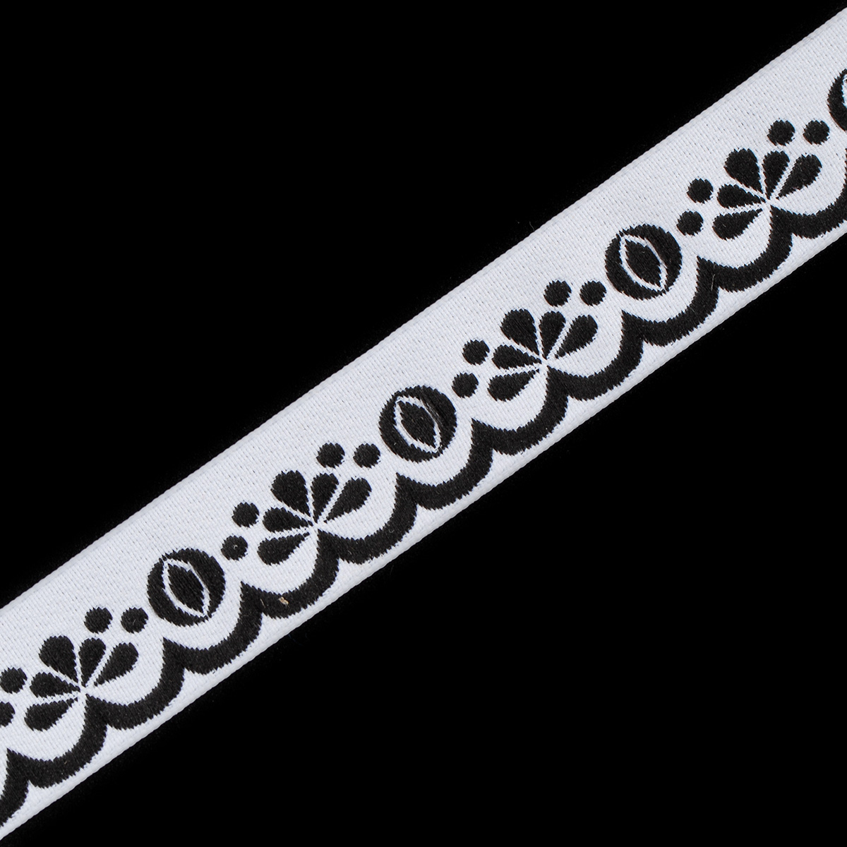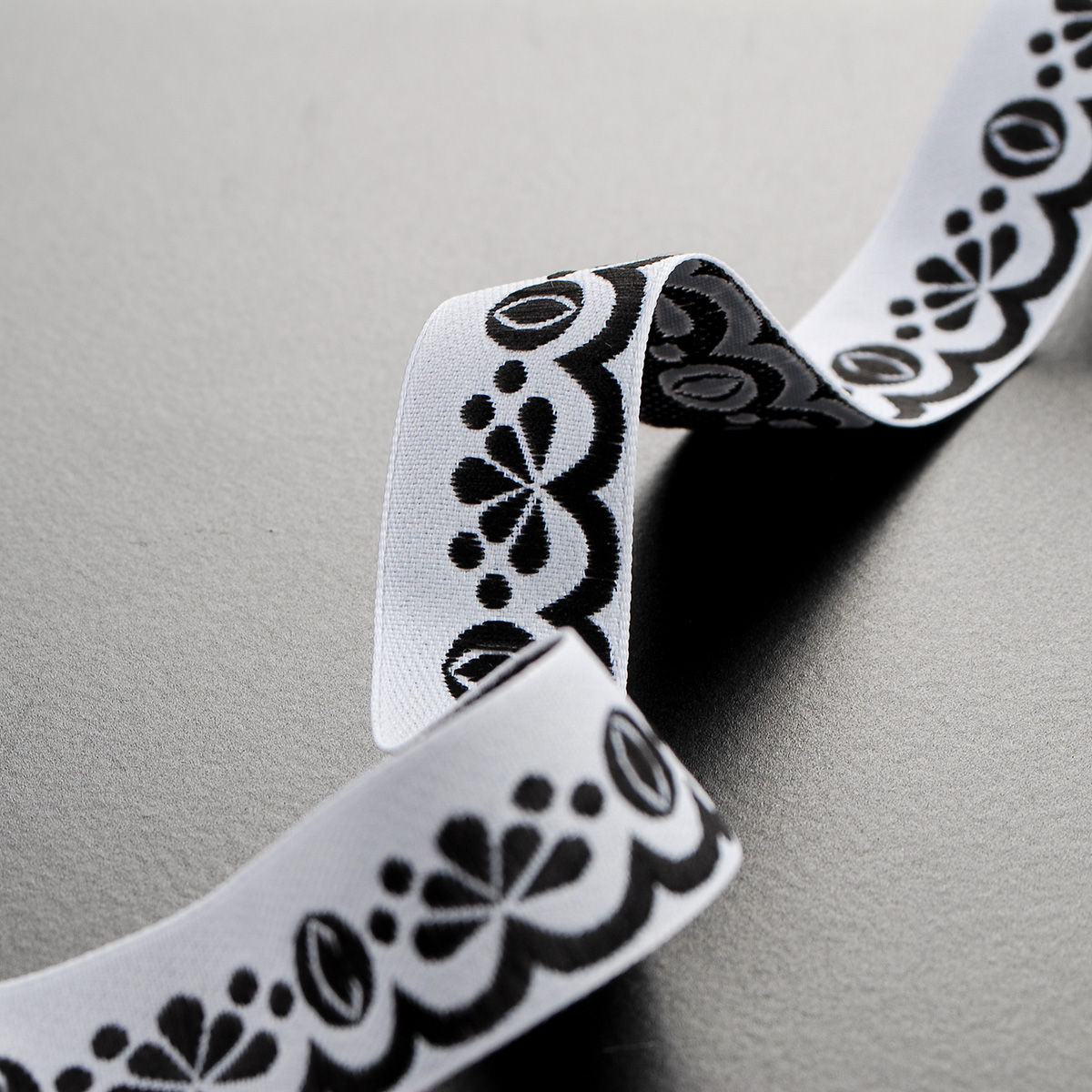 Krojová stuha bílá s folklórním vzorem výšivky černé barvy. Krojová stuha je vhodná na dozdobení nejen krojového oděvu.