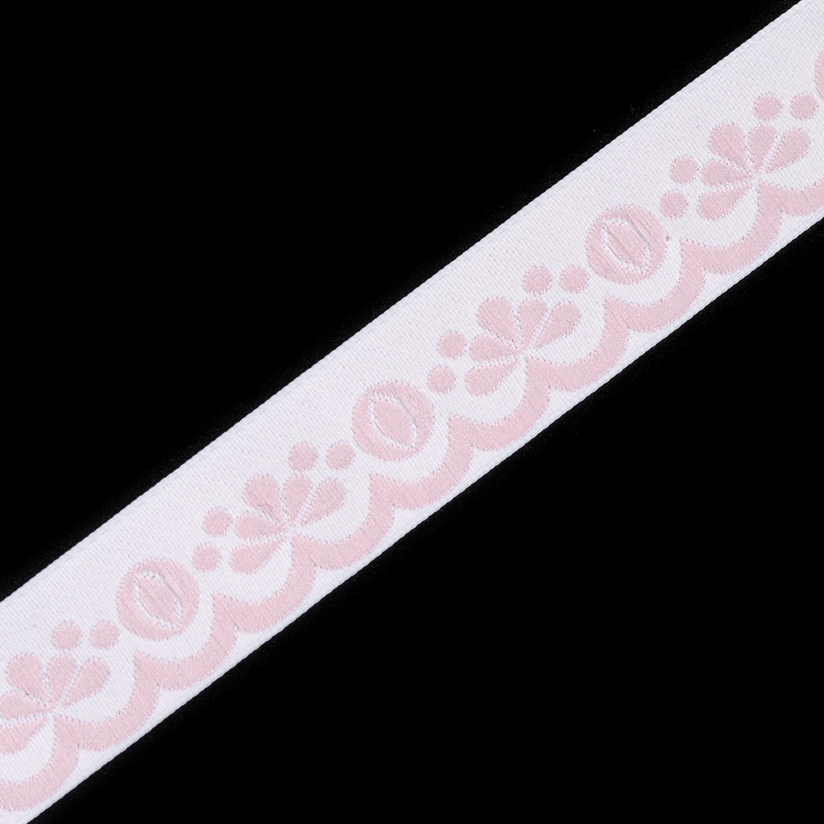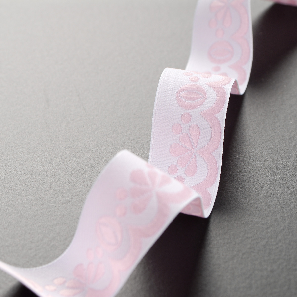 Krojová stuha bílá s folklórním vzorem výšivky světle růžové barvy. Krojová stuha je vhodná na dozdobení nejen krojového oděvu.