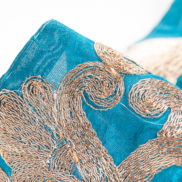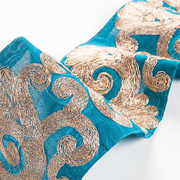Stuha vyšívana /strong> na šantunogévm podkladu barvy sytě tyrkysové barvy se vzorem květinového ornamentu vyšitého rexovou zlatoou nití. Stuha vyšívaná neboli textilní porta borta je vhodá na dozdobení oděvu, historického kostýmu nebo zdobení tašky, klobouku a podobně.